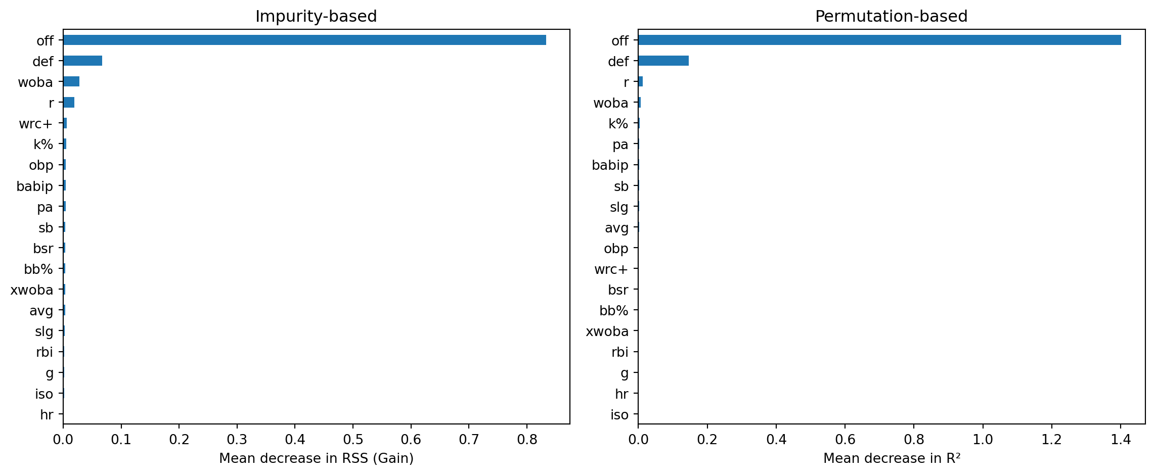 from sklearn.inspection import permutation_importance# Impurity-based (gain)gain_imp = pd.Series( oob_rf.feature_importances_, index=X.columns).sort_values(ascending=True)# Permutation-basedperm = permutation_importance( oob_rf, X, y, n_repeats=10, random_state=42)perm_imp = pd.Series( perm.importances_mean, index=X.columns).sort_values(ascending=True)fig, axes = plt.subplots(1, 2, figsize=(12, 5))gain_imp.plot.barh(ax=axes[0])axes[0].set_xlabel("Mean decrease in RSS (Gain)")axes[0].set_title("Impurity-based")perm_imp.plot.barh(ax=axes[1])axes[1].set_xlabel("Mean decrease in R²")axes[1].set_title("Permutation-based")plt.tight_layout()plt.show()