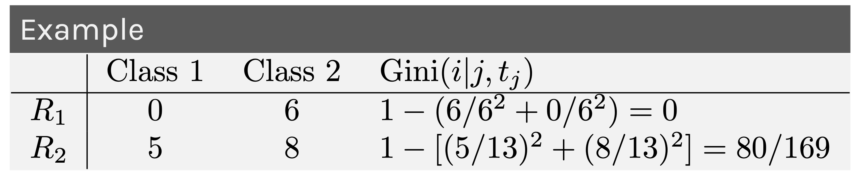 We can try to find the predictor \(j\) and the threshold \(t_j\) that minimizes the average Gini Index over the two regions, weighted by the population of the regions (\(N_i\) is the number of training points in region \(R_i\)):