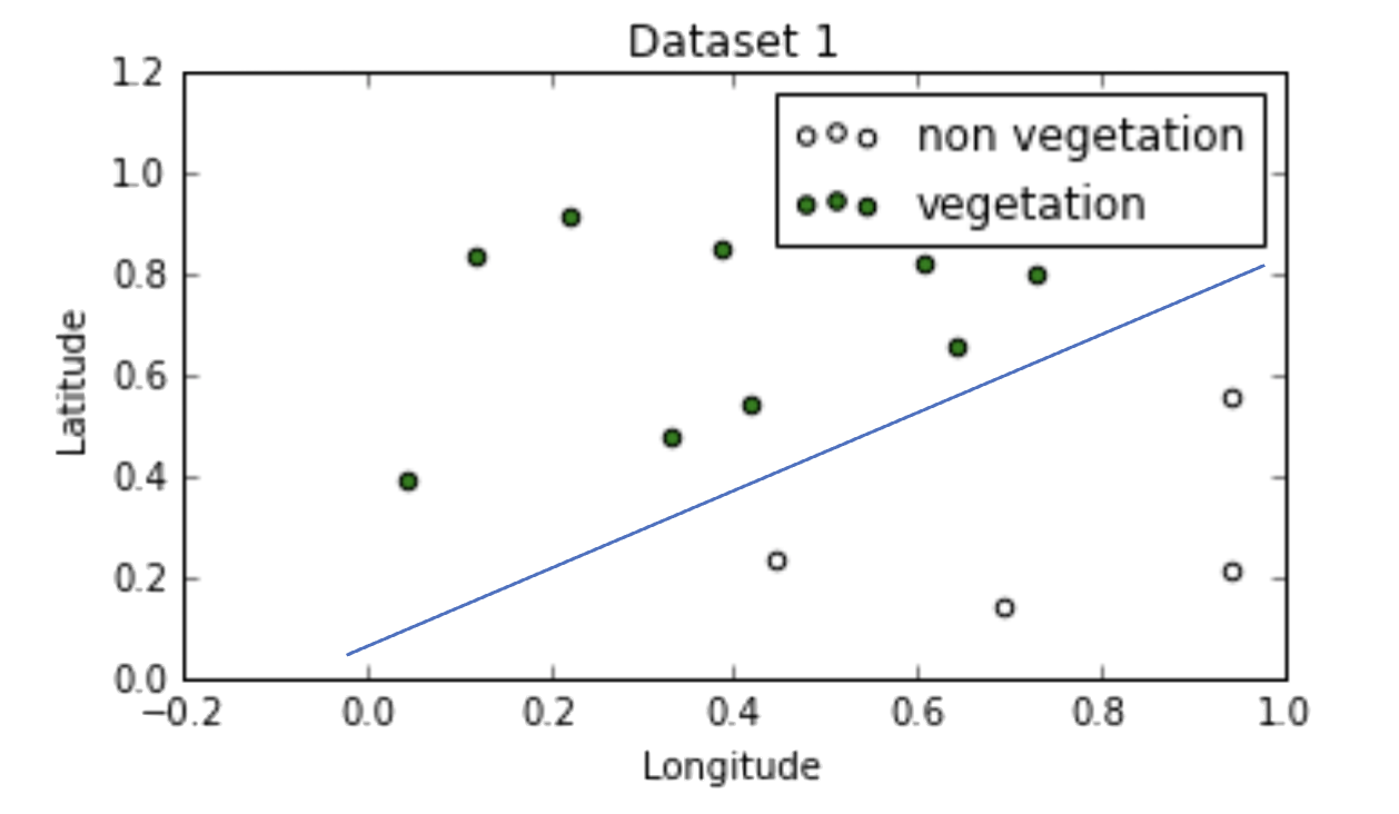 The decision boundary is \[−0.8 x_1+x_2=0 \rightarrow x_2=0.8x_1\]