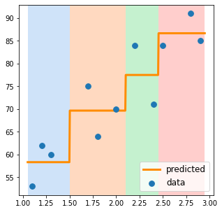 Instead of finding decision boundaries that separate classes, we partition the feature space into regions where we predict the mean response
