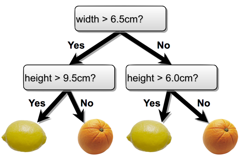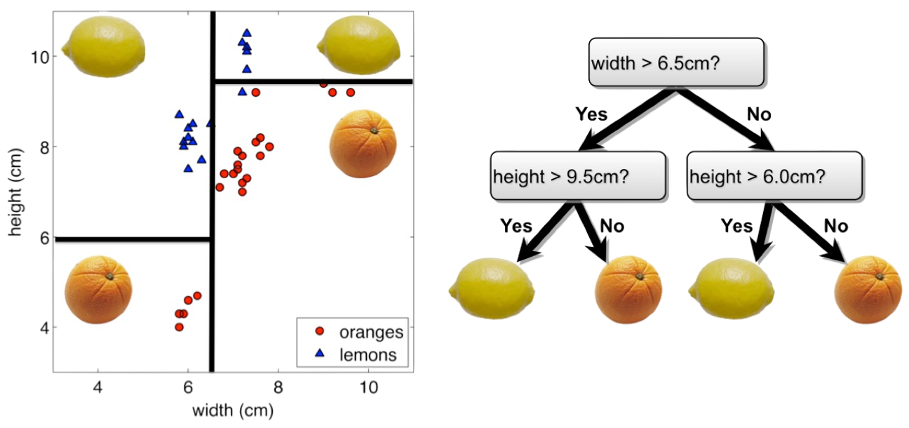 Formally, a decision tree model is one in which the final outcome of the model is based on a series of comparisons of the values of predictors against threshold values. Each comparison and branching represents splitting a region in the feature space on a single feature. Typically, at each iteration, we split once along one dimension (one predictor).